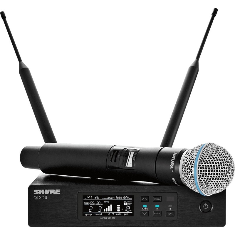 Composé d'un récepteur QLXD4E, d'un émetteur main QLXD2 équipé d’une capsule dynamique supercardioïde BETA58A et d’une pince micro WA371.